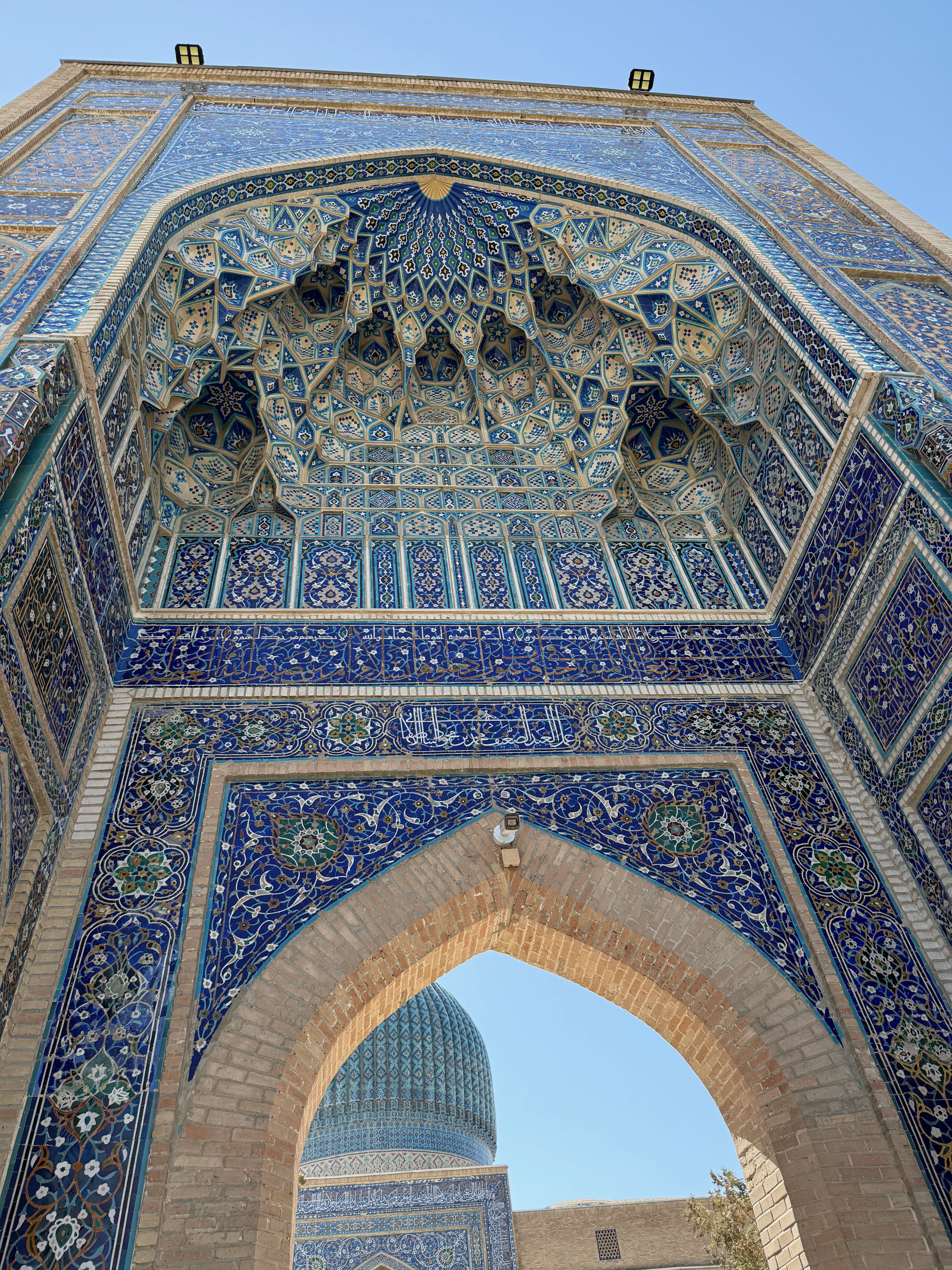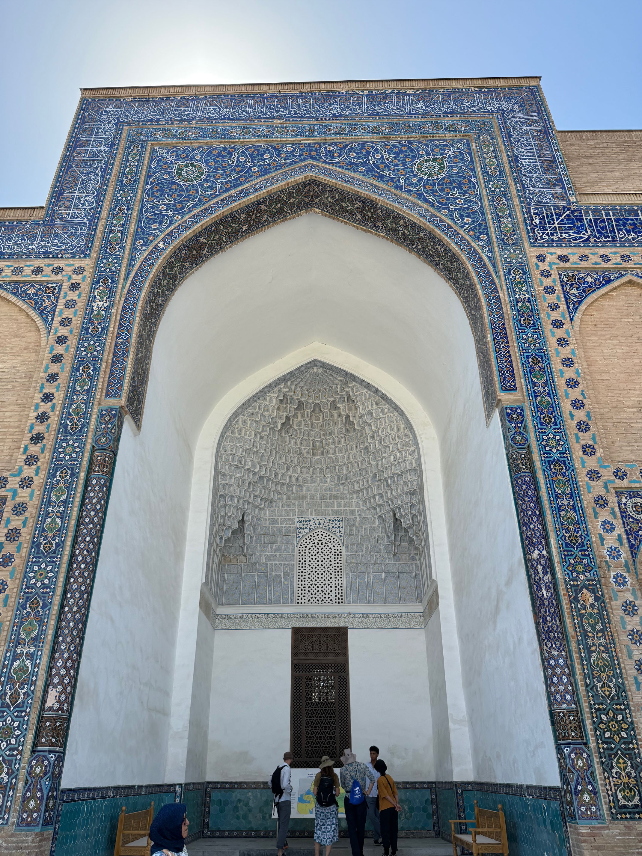 Başkanım, Semerkant ile ilgili bilgileri güncellerken, aşağıya bakınca otelin avlusunda, Timur’un aracını gördüm. Hemen otel lobisine indim, Timur’la kucaklaştık ve Hollanda’daki Timur’a göndermek için bir hatıra fotoğraf çektirdik. Beş altı dakika sonra Semerkant’ta ilk ziyaret edeceğimiz Emir Timur Türbesi, yani Gur-i Emir, bir başka ifadeyle “Kudretin ve Faniliğin Anıtı”na ulaştık.