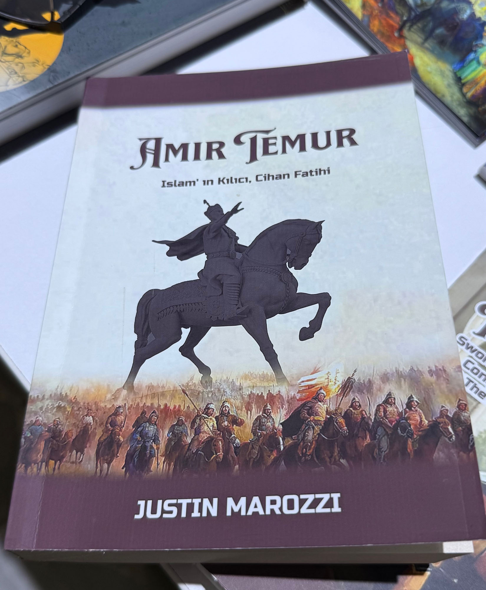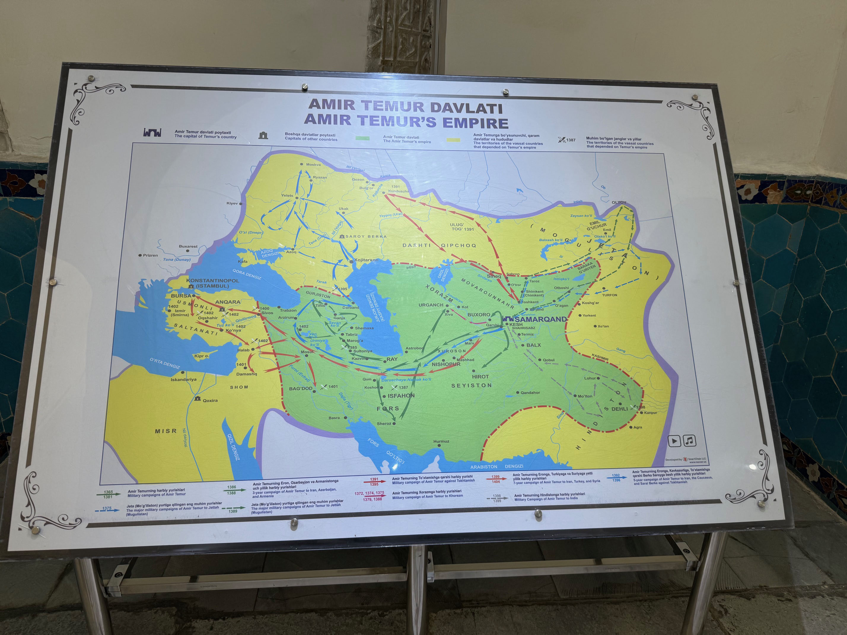 Türbe içindeki kitap reyonunda, Justin Marozzi tarafından yazılmış ve Türkçe baskısı da yapılmış “Amir Timur: İslam’ın Kılıcı, Cihan Fatihi” adlı kitabın önsözüne hızlıca bir göz attım. Şu bilgilere rastladım: “Emir Timur, yaklaşık 35 yıl boyunca Asya’nın dört bir tarafına seferler düzenlemiş Kafkasya, bugünkü İran, Hindistan bölgeleri, Altın Orda Devleti ve Anadolu’ya kadar uzanan geniş bir coğrafyada hakimiyet kurmuş. Öyle ki Emir Timur, bir yandan büyük yıkımlara yol açan fetihleri, kendisine direnen ve isyan edenleri acımasızca öldürdüğü eleştirilirken, diğer yandan da sanat, bilim ve mimariyi desteklemesiyle övülmektedir. Fethettiği bölgelerden ustaları, sanatçıları ve bilim insanlarını Semerkant’a getirerek şehri bir bilim, kültür, sanat, ticaret ve siyaset merkezi haline getirir.”