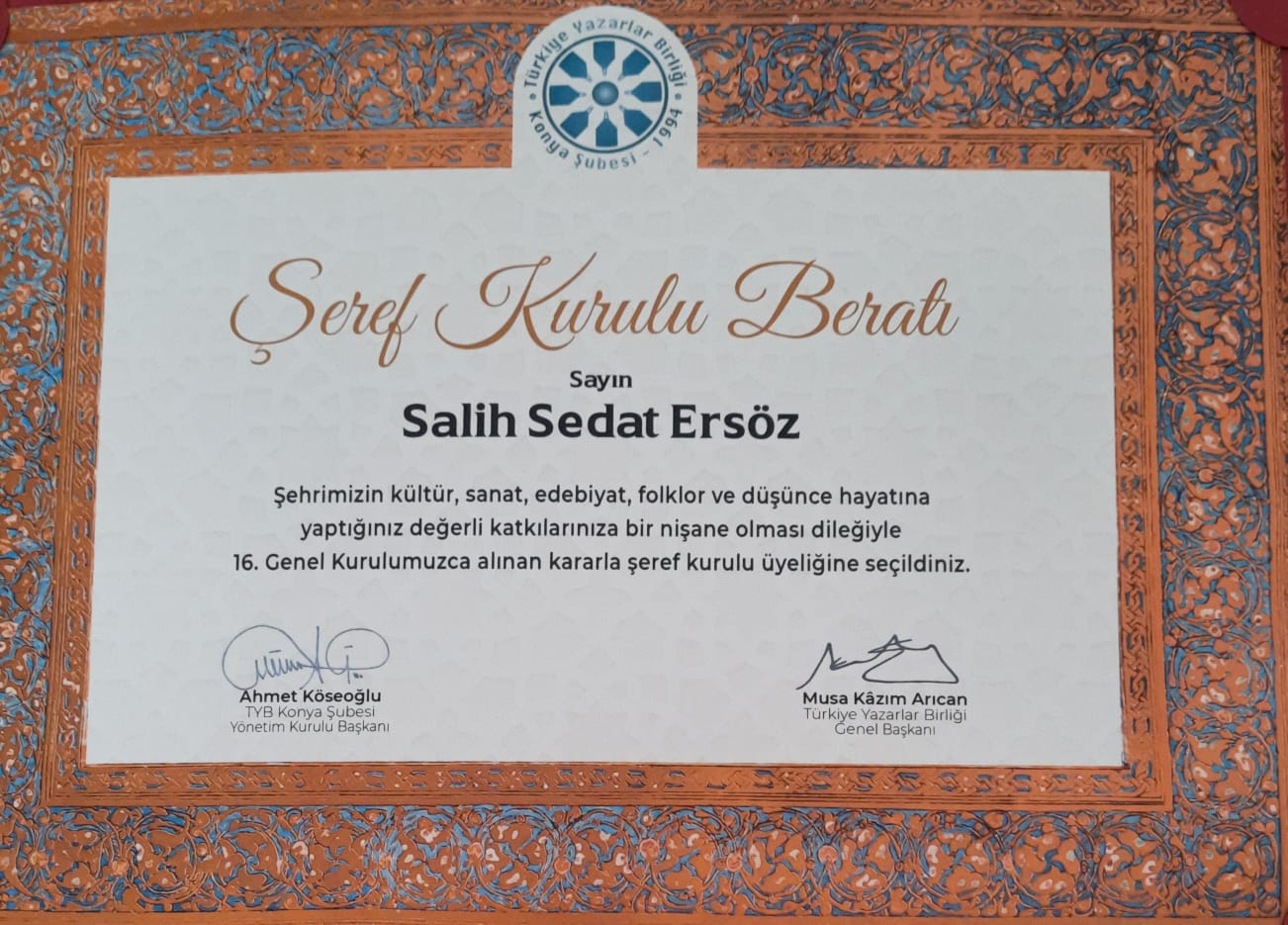 Genel kurulda bazı isimler Şeref Kuruluna seçilerek onurlandırılmıştır. Şeref Kuruluna dâhil edilen isimler arsında şahsımın da bulunması bendenizi oldukça memnun etmiştir. TYB Konya Şubesi'nin Genel Kurulunda şahsımı Şeref Kurulu Üyeliği ile onurlandıran Genel Başkan Musa Kâzım Arıcan Hocama, Konya Şube Başkanı Ahmet Köseoğlu kardeşime ve Yönetim Kurulu Üyelerine şükranlarımı arz ediyorum. Şeref Kurulu Üyeliği belgesini alınca şu cümleler ile genel kurula hitap ettim: