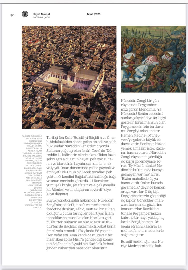 Seyahat öncesi İslâm tarihi kitaplarına göz atıp Nureddin Zengi ve Selahaddin Eyyubi maddelerini, uzun yolculuğumuzda fırsat olursa göz atarım diye fotokopi ettirmiştim. Otobüsün zayıf iç aydınlatmasına ve gözlerimin zorlanmasına aldırış etmeden İslâm tarihinin bu büyük iki şahsiyetine muhabbetimin artmasına vesile olan yazıların altını çizerek heyecanla okudum.